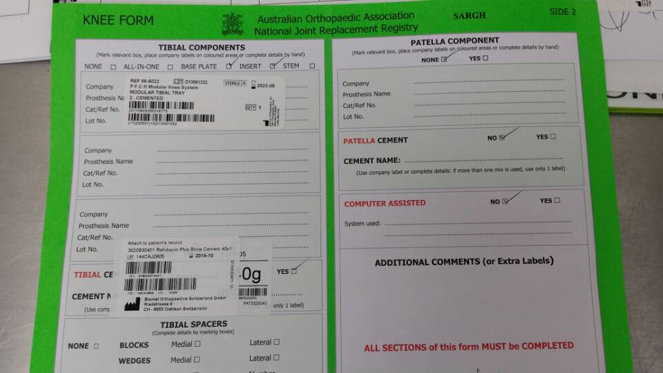 在医院层面进行的随访登记主要在手术室内完成,登记表已经翻译好正在应用。医生上台前完成第一页患者的基本信息、诊断等内容。手术室护士拆封假体上台后将合格证贴在对应部位。手术完毕夹放病历中,护士放入专柜。每月由专人寄往关节登记中心。