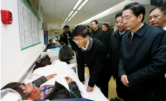 中央政法委书记孟建柱来到昆明市第一人民医院看望慰问受伤群众和遇难者家属