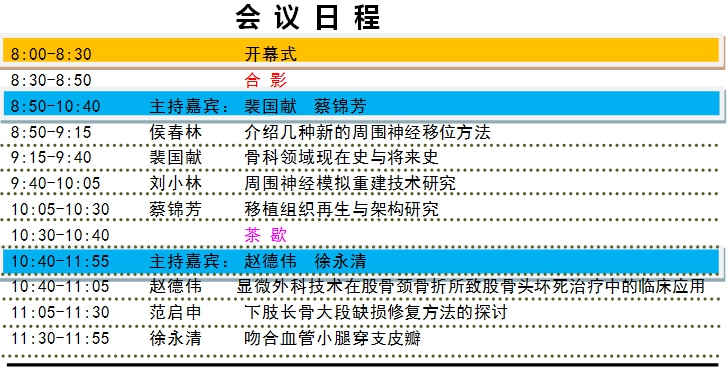 会议时间为2014年4月24-26日。24号全天报到,18:30欢迎晚宴。地点:鸢(yuan)飞大酒店三楼“锦绣潍坊厅”。20:00(晚宴结束后),举行中国医师协会骨科分会显微修复工作委员会成立大会,地点:鸢飞大酒店二楼南会议厅。