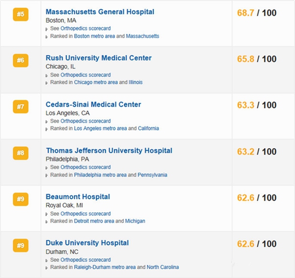 全美骨科综合实力医院Top 10