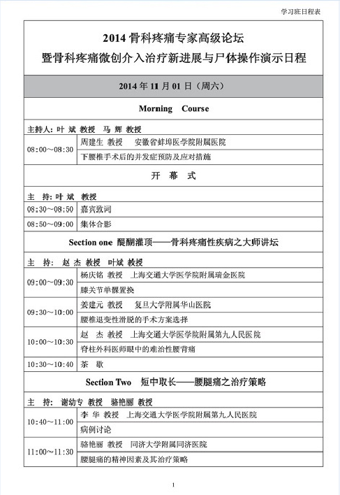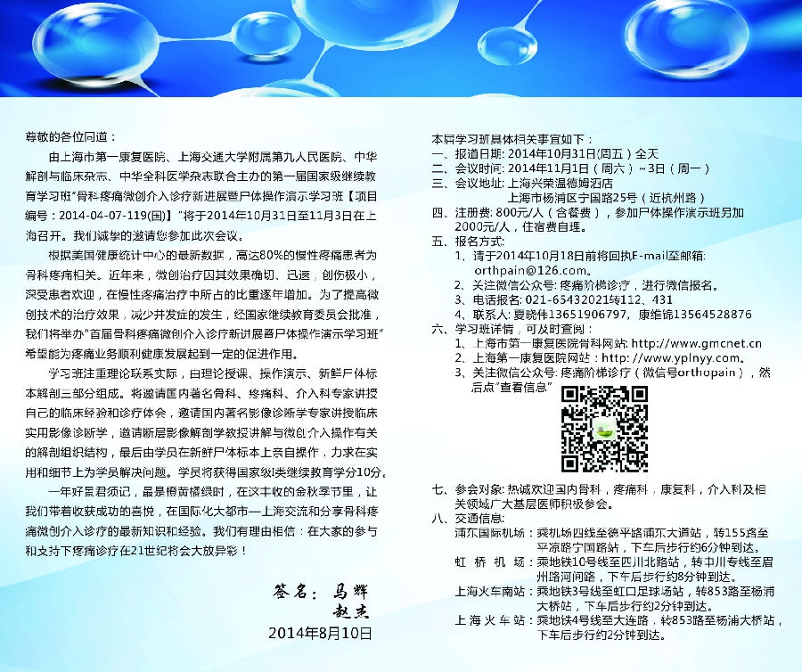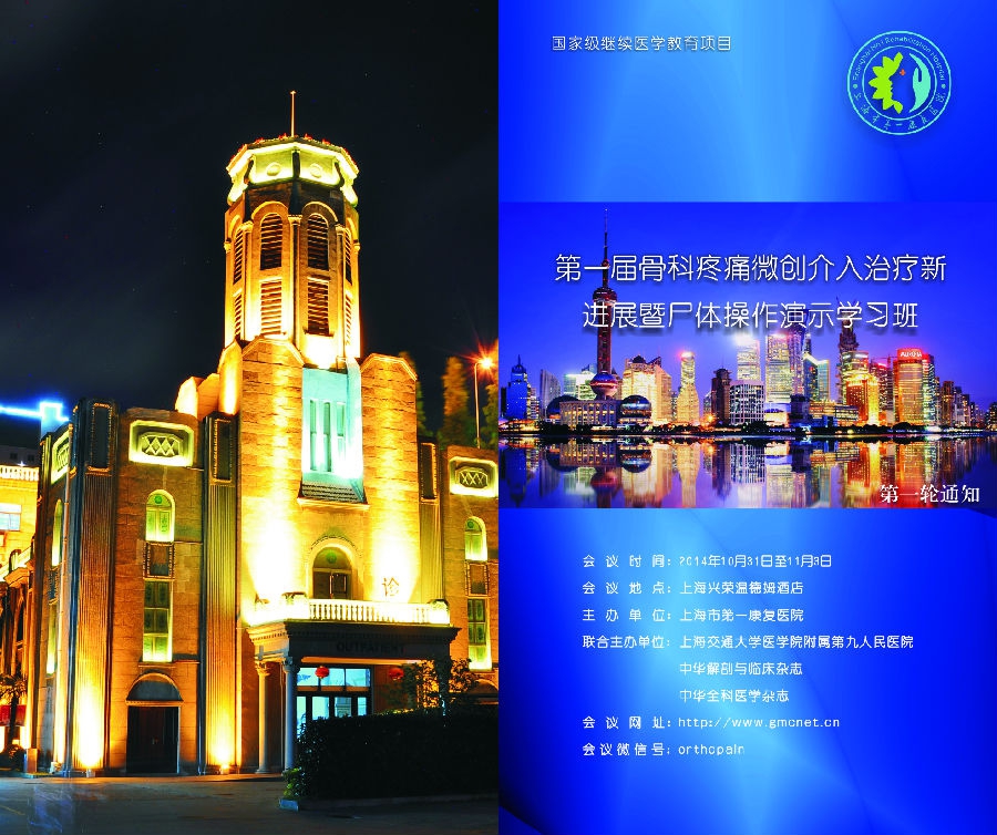 由上海市第一康复医院、上海交通大学附属第九人民医院、中华解剖与临床杂志、中华全科医学杂志联合主办的第一届国家级继续教育学习班“骨科疼痛微创介入诊疗新进展暨尸体操作演示学习班【项目编号:2014-04-07-119(国)】”将于2014年10月31日至11月3日在上海召开。我们诚挚的邀请您参加此次会议。