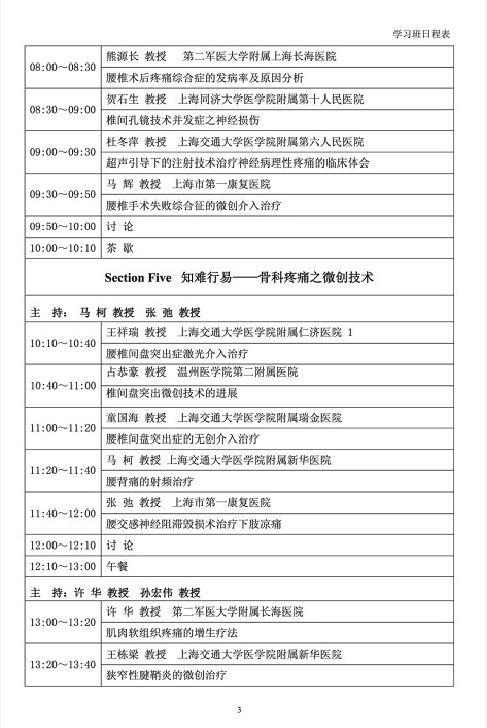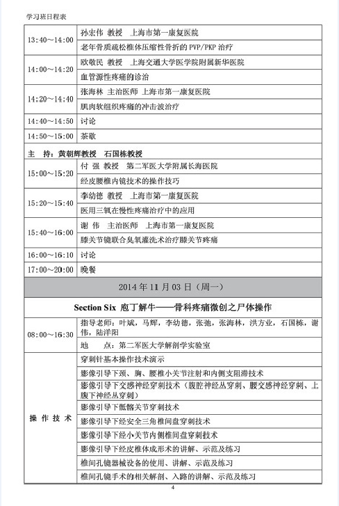 学习班注重理论联系实际,由理论授课、操作演示、新鲜尸体标本解剖三部分组成。将邀请国内著名骨科、疼痛科、介入科专家讲授自己的临床经验和诊疗体会,邀请国内著名影像诊断学专家讲授临床实用影像诊断学,邀请断层影像解剖学教授讲解与微创介入操作有关的解剖组织结构,最后由学员在新鲜尸体标本上亲自操作,力求在实用和细节上为学员解决问题。学员将获得国家级I类继续教育学分10分。