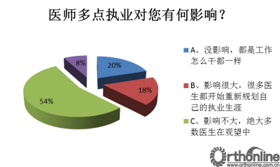 调查结果显示,参与调查的医生中,有86%认为“医师多点执业” 政策好,并对这一政策表示支持;54.4%的医生认为,这一政策对医生影响不大,并对此政策持观望态度。从调查中,我们不难看出,医师多点执业作为医改新政,已受到广大医生的关注和认可。