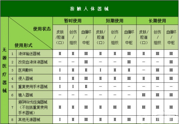 无源接触人体器械:根据使用时限分为暂时使用、短期使用、长期使用;接触人体的部位分为皮肤或腔道(口)、创伤或组织、血液循环系统或者中枢神经系统;