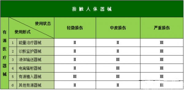 有源接触人体器械:根据失控后可能造成的损伤程度,分为轻微损伤、中度损伤、严重损伤;