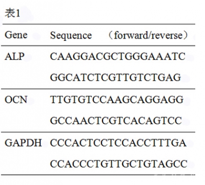 为了观察材料对细胞成骨分化的影响,将一半样品培养于不具成骨诱导活性的基础培养基(basal medium, BM)中,另一半样品培养于添加了成骨诱导因子的诱导培养基(osteogenic medium, OM)中。我们检测碱性磷酸酶活性(ALP),钙含量以及成骨基因表达来反映成骨活性。在培养10天后,用0.1% Triton X-100裂解细胞使其释放碱性磷酸酶,使用Alkaline Phosphatase Assay Kit(Beyotime, China)对裂解液中ALP活性进行测定,并用细胞总蛋白含量进行校正。培养14天后,在培养板中加入1 ml 0.5 N的盐酸过夜孵育释放钙离子,并用Calcium Colorimetric Assay Kit(Sigma-Aldrich)测定钙含量。培养14天后,使用qRT-PCR检测细胞成骨相关基因ALP和骨钙素(osteocalcin , OCN)的表达量,内参基因为GAPDH,引物在表1中列出。