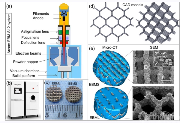 医用钛合金已广泛应用于骨科内植物的生产制造,然而传统的致密钛合金内植物由于其较高的弹性模量,往往会引起应力遮挡效应,从而影响内植物与骨组织的整合并导致无菌性松动,最终影响内植物的稳定性。近年来,孔隙金属作为一种新型内植物得到了极大的关注,其具有与骨组织相似的弹性模量,而且其相互连通的孔隙结构也增大了与组织的接触面积,从而大大提高内植物的骨整合能力。制造孔隙金属的方法有很多,电子束熔融技术(Electron beam melting,EBM)作为增材制造技术(additive manufacturing ,AM)的一种,其最大的优势是可以高效地制造具有复杂结构的金属内植物,从而为个性化定制提供了可能。