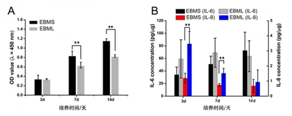 在第3天时,细胞活性在EBMS和EBML之间并没有表现出差异(p > 0.05,图 2a),随着培养时间的延长,细胞活性逐渐增高,在第7天和第14天,EBMS的细胞活性显著高于EBML。炎症因子的结果(图 2b)表明IL-6在两组之间没有显著性差异,在第3天和第7天时,EBML有较高浓度的IL-8。