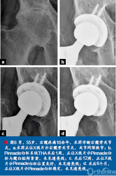 钽金属骨小梁臼杯植入时这种臼杯与骨之间的间隙现象似乎不影响臼杯的长期稳定性。同钽金属骨小梁臼杯类似,TTM臼杯因具有较高的摩擦系数,植入后容易出现透亮线,但短期随访显示臼杯稳定。