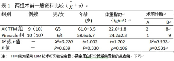 本研究采用3D打印(EBM技术)TTM臼杯髋关节系统行THA手术,并以经典Pinnacle臼杯髋关节系统为对照进行前瞻性研究,探讨TTM臼杯的初始稳定性、骨长入能力;评估TTM臼杯的短期临床疗效。