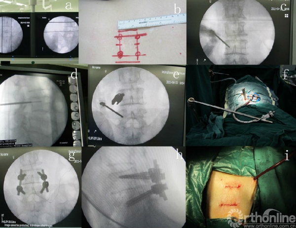 图 1. a 透视下定位手术节段椎体横突中线及椎弓根位置;b 体表投影画线;c 经椎弓根处置入定位针;d 经克氏针引导拧入椎弓根螺钉;e 已拧入椎弓根螺钉,并在下一椎体椎弓根处置入定位针;f 建立工作通道,并经工作通道进行脊髓和神经根减压;g、h 完成减压后正侧位透视见内固定位置良好;i 术后伤口及引流管;