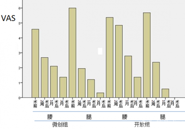 图 2. 微创组和开放组病例术前及术后腰及下肢的VAS评分