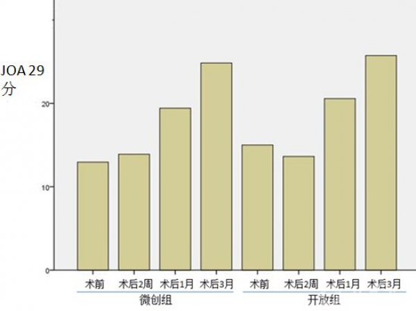 根据两组患者术后随访期间分别进行的VAS、ODI、JOA 29分功能评价结果,两组患者之间评分结果在术后1月、3月时并无明显差异,且较术前呈持续改善的表现。根据随访结果,可以推断,微创手术技术用于脊柱手术其安全性和治疗效果,从近期随访结果看,和传统开放手术是一致的。