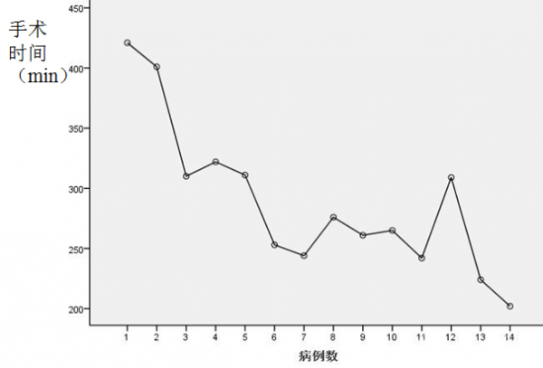 本研究结果提示,微创通道下后路腰椎椎间融合内固定术,治疗腰椎退行性病变和脊柱肿瘤的患者,可以有效减少术中出血、术后引流及引流管保留时间。可有效避免因长期保留伤口引流管而导致的逆行感染的发生。但是结果提示,微创手术需要的手术时间要明显多于传统开放手术的手术时间(P<0.01),这无疑会增加患者术中的麻醉时间以及由此引起的其他并发症发生率。但是有文献报道微创技术的手术时间和开放手术的手术时间并无统计学差异,甚至在均值上微创组的手术时间要略低于开放组。研究认为微创手术的熟练开展需要一个较长的学习曲线,所以手术时间要明显长于开放手术的时间。但是我们统计了同一术者的做单节段腰椎手术的手术时间,可以发现其手术时间呈总体下降趋势(图5)。由此可以推测若是微创手术技术成熟,或者有大量的微创手术病例参与对比,手术时间一项可能会出现不一样的结果。