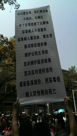另据《忠县网》消息,时隔重庆医改六天后,重庆市民于3月31日自发聚集占道,对重庆市医改政策表示严重抗议,抗议者情绪激动,特别是病患以及病患家属,拉起横幅誓死捍卫生存的权利。