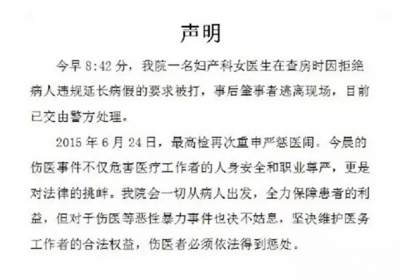 27日早上8点42分,上海交通大学医学院附属瑞金医院一名妇产科女医生在查房时因拒绝病人违规延长病假的要求被打,事后肇事者逃离现场。