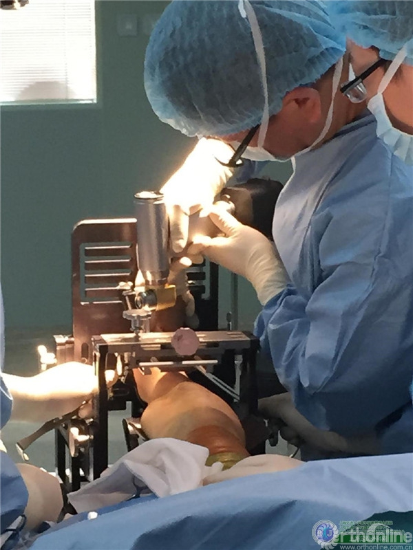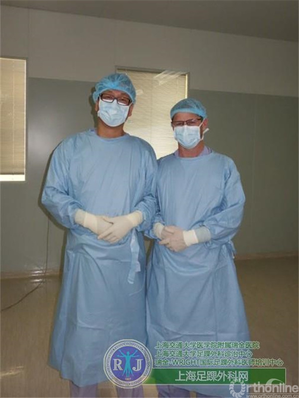 上海瑞金医院骨科足踝外科团队于2015年10月28日上午成功对该患者实施了第三代全踝关节假体(INBONE® II. Wright.)置换手术,手术过程非常顺利。手术中首先清理踝关节内外侧炎性组织及骨赘,将患足置于专门的定制支架中,在透视下反复调整足踝及导针位置,力求最高精确度。在截骨导板的定位下进行踝关节胫骨及距骨的截骨,试样假体大小,置入合适匹配的踝关节假体及垫片完成全踝关节假体的置换,全程手术时间90分钟。完成的全踝关节假体置换位置精确,假体设计稳定牢固,踝关节内外侧软组织平衡,达到了预期的效果。术后患者恢复良好,手术取得圆满成功。患者在休养五周左右以后可以下地行走,去除踝关节炎疼痛畸形的同时能够保留踝关节的活动度,为生活和工作提供极大便利。
