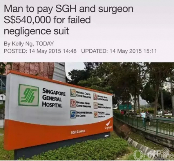 新加坡《今日报》 2015年5月14日:一原告男子在其诉新加坡总医院和该医院一名骨科医生的案件中败诉,法院判令原告支付两名被告各270,000新加坡元(译者注:总共约合人民币250万元)的法律费用。此外,原告安德鲁·蔡(Andrew Chua)还需支付被告的垫付费用和法院专门任命审理此案的陪审员的费用。