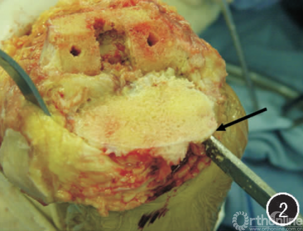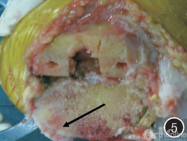图5屈膝、内翻畸形患者胫骨平台截骨后,见骨赘与正常骨质之间一隐约的白线(箭),为尚未骨化的软骨组织