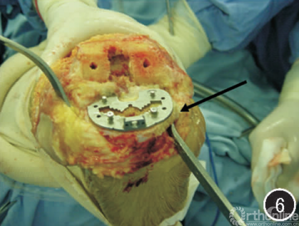 因此,正确的做法是胫骨平台假体必须要放置在白线之内,否则就要旋转错位。如果我们不将胫骨平台假体放置在白线之内,那就会使胫骨平台假体旋前,进而造成股骨与胫骨的受力点向胫骨平台后方转移,产生胫骨平台后方的应力集中,长期应力集中而造成胫骨平台聚乙烯垫的磨损和破坏。正确的手术操作应该是:把胫骨平台假体放到白线内之后,切除假体没有覆盖的骨赘,这样既矫正了旋转畸形,又能松解膝关节内侧副韧带的紧张(见图6)。