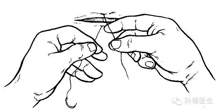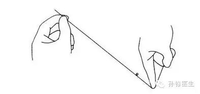 外科医生应该两只手都会打结。打结过程中手指不应该插入线结太深、只要使用指尖(第一指节的前1/4~1/2)套线即可,这样动作显得轻巧,时间也短,如下图(1)。