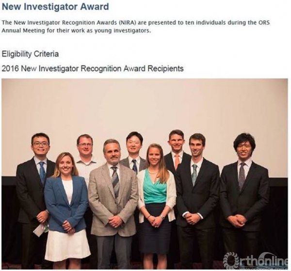 NIRA是美国骨科研究协会年会设立的旨在鼓励年轻学者从事骨科学研究的奖项,该奖由年会委员会从参加大会的论文中提名32位候选者进入决赛,被提名的青年学者在大会上经过口头汇报,壁报展以及问答环节后,由评委评分,得分最高的10人成为获奖者。本年度评出的其他获奖者分别来自美国、加拿大、韩国以及日本。