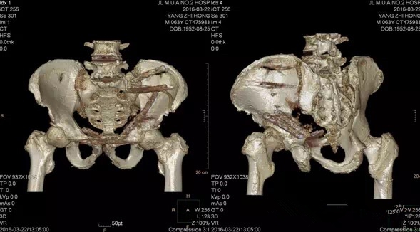 患者,男,63岁,于19天前(2016-2-20日)因车祸致骨盆骨折、左小腿开放骨折、左肩胛骨骨折、失血性休克、创伤性湿肺等,急诊到当地医院就诊,当时为了抢救患者生命,骨盆及髋臼的骨折没有得到及时处理。当患者病情稳定了,骨盆及髋臼也失去了最佳治疗时机,由于骨盆及髋臼骨折复杂,患者于2016-3-9日由“解放军第二0八医院”转至我院。找到了我院创伤外科吴丹凯主任,吴主任对复杂骨盆及髋臼骨折的诊治经验丰富,年手术量达上千例。此病人骨盆及髋臼损伤严重,骨盆为AO:61 C2.2型骨折,需前路切开对骨折复位、固定;髋臼为AO:62 B1.2型骨折,需前后路联合对髋臼进行复位、固定,手术创伤大,且伤后已经20余天,骨折周围已经有纤维连接,手术难度极高。吴丹凯主任仔细查看病人,详细阅读术前X光片及三维CT后作出了初步手术方案。经介入科乔连铭主任会诊后,于2016-3-16日给予左侧骶外侧动脉栓塞术、左侧臀下动脉栓塞术、左侧臀上动脉栓塞术及左侧闭孔动脉栓塞术。于2016-3-17日全麻下,行骨盆及髋臼陈旧性骨折切开复位内固定术。通过多科室的配合,全面的术前准备,加之吴丹凯主任丰富的经验及精湛的手术技术,手术只用了3个小时就完成了,并且骨折达到了解剖复位,术中出血约2000ml,出血比预计少很多。由于患者合并创伤性湿肺,术后患者进入本院重症监护室。术后2天,本人病情平稳,转回创伤外科。现患者恢复良好。