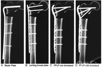 股骨侧方钢板螺钉重建有很高的失败率,主张髓内固定IMN+适当的阻挡钉技术,可以增加髓内钉的稳定性,防止切割。