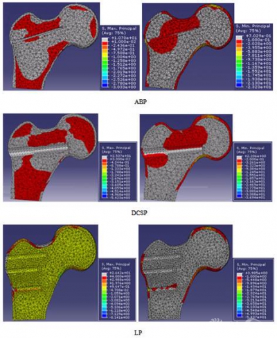 Maximum (left column) and minimum (right column) principal stress distributions in femoral heads which were implanted with ABP, DCSP and LP as viewed from the coronal midline.