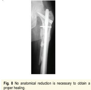 4.正确的进针点和足够的髓内钉长度,即使不能达到解剖复位,也能收到满意的愈合结果;