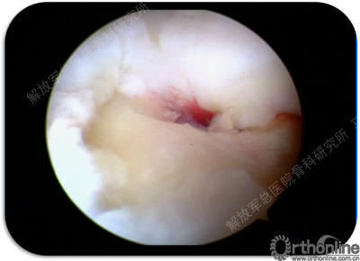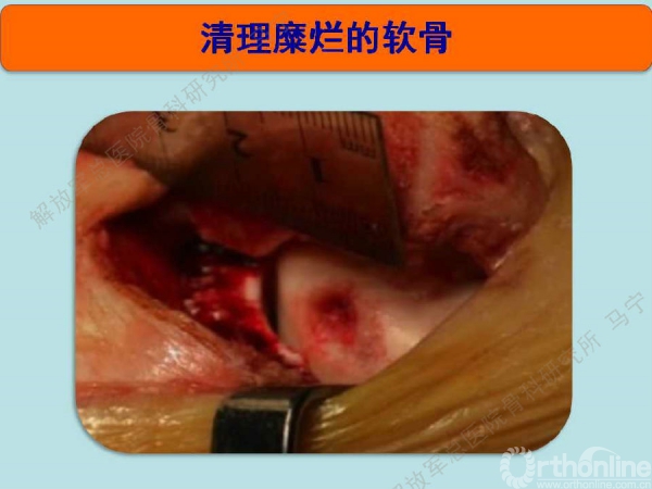 软骨已经完全破坏,损伤软骨下骨已经囊性变,囊内为滑模样组织。