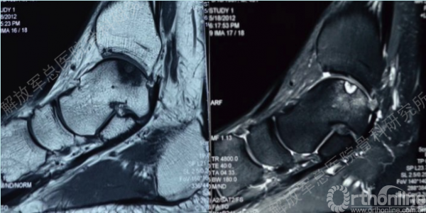 同样距骨软骨损伤完全可以利用第四代组织工程软骨进行修复,经过MRI检查可以诊断损伤部位,范围。此例患者软骨损伤存在软骨下骨板破坏及骨缺损。