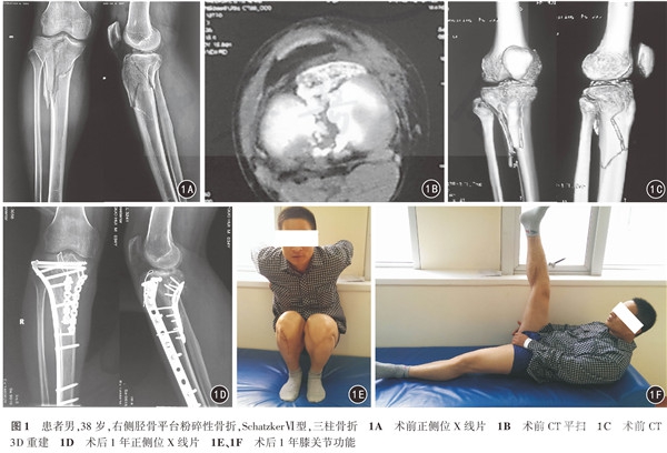 1. 2. 3 手术固定方法 根据手术切口依次切开暴露骨折进行复位固定,对于胫骨平台多柱骨折,复位顺序是先简单柱骨折,再至复杂柱骨折。后柱固定支撑钢板,骨折块波及范围较大、较粉碎的一般选择3.5mm桡骨掌侧锁定钢板,骨折块波及范围小、简单的选3.5mm重建锁定钢板;内侧柱固定支撑钢板一般选择3.5mm重建锁定钢板,外侧柱固定支撑钢板一般选择4.5mm锁定高尔夫钢板。后柱复位过程中保持膝关节呈过伸位,复位塌陷的骨块后临时以1.5或2.0mm克氏针固定并植骨,所植骨材料为自体髂骨、异体骨、人工骨(Wright公司,美国)。手术中对半月板和前、后交叉韧带及侧副韧带进行常规探查,半月板损伤11例患者给予部分切除修整或缝合,膝关节侧方应力试验稳定性较差者3例1期进行侧副韧带修复,伴有前后交叉韧带止点撕脱骨折者复位后给予钢丝内固定。术毕,C形臂X线机透视下确认关节面平整、膝关节恢复正常的内翻角和后倾角以及内固定物均在位后,逐层关闭切口,常规每个切口放置1支负压引流管。
