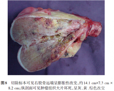 患者于2008年9月8日行右股骨远端脂肪肉瘤大段切除+全膝肿瘤型假体关节置换术。切除标本大体观:右股骨远端呈膨胀性改变,约14.1cm×7.3cm×8.2cm;纵剖面可见肿瘤组织大片坏死,呈灰、黄、棕色改变(图8)。术后患者恢复良好。