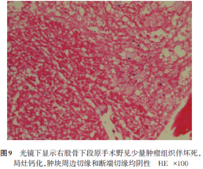 术后病理组织学检查报告:右股骨下段原手术野见少量肿瘤组织伴坏死,局灶钙化,肿块周边切缘和断端切缘均阴性(图9)。免疫组织化学检查:CDK4-、MDM2+。