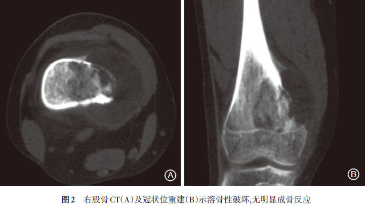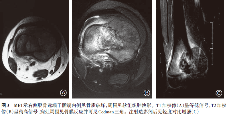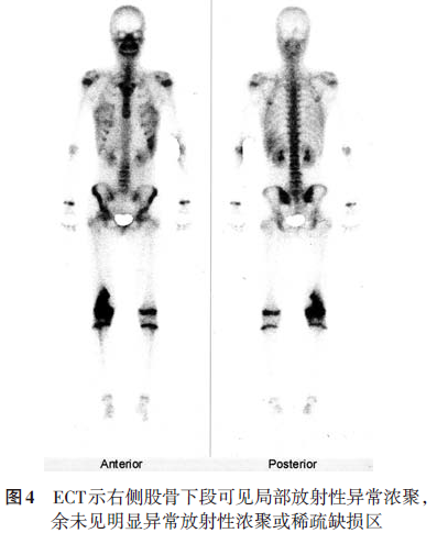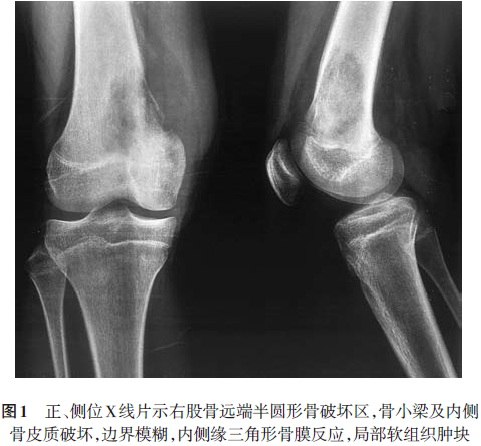 显示心、肺、膈均未见明显异常。正、侧位X线片(2008.6.14)示右股骨远端可见半圆形骨破坏区,骨小梁及内侧骨皮质破坏,边界模糊,内侧缘三角形骨膜反应,局部软组织肿块,提示右股骨恶性肿瘤,膝关节未见明显异常(图1)。CT(2008.6.17)示右侧股骨下段干骺端骨质密度不均匀,内侧骨皮质破坏,骨膜增厚外突(图2)。MRI(2008.6.16)示右侧股骨远端干骺端内侧见骨质破坏,周围见软组织肿块影;T1加权像呈等低信号,T2加权像呈稍高信号,病灶周围见骨膜反应并可见Codman三角,注射造影剂后见轻度对比增强(图3)。ECT(2008.6.17)静脉注射骨显像剂3h后行全身前后位骨显像,骨显像尚清晰,右侧股骨下段可见局部放射性异常浓聚,余未见明显异常放射性浓聚或稀疏缺损区(图4)。