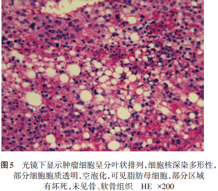 病理组织学检查是诊断原发性骨内脂肪肉瘤的唯一手段,其诊断标准为:①具备典型的组织病理学特征;②肿瘤起源于骨而非来自周围组织,并排除转移可能。本例通过影像学及病理学检查,排除了骨肉瘤、呈多形性分化的恶性纤维组织细胞瘤(malignant fibrous histiocytom,MFH)等可能的诊断,诊断为骨内多形性脂肪肉瘤。