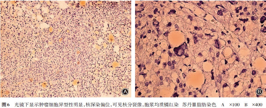 患者于2008年6月23日行活检手术,术中见肿瘤组织呈淡黄色、液化的软组织。术中病理组织学检查提示小圆细胞肿瘤,考虑恶性。术后常规病理组织学报告右股骨下段恶性肿瘤,肿瘤细胞呈分叶状排列,细胞核深染多形性,部分胞质透明,空泡化,可见脂肪母细胞,部分区域有坏死,未见骨、软骨组织,考虑为骨内脂肪肉瘤(图5)。免疫组织化学检查结果提示S⁃100P+、CD117-、Osteonectin+、Osteopontin+、CD34-、Bcl⁃2-、P53+++、EMA-、CD68+、CDK4++、MDM2不明确。首先考虑脂肪肉瘤,多形性。苏丹Ⅲ脂肪染色镜下观察显示肿瘤细胞异型性明显,核深染偏位,可见核分裂相,胞浆均质橘红染(图6)。