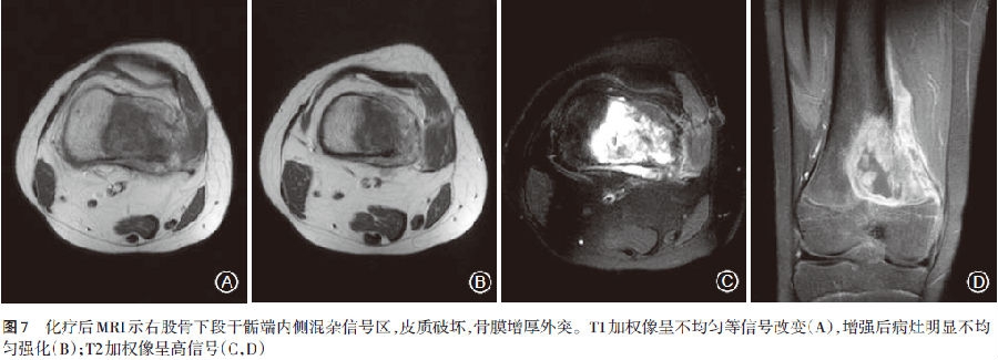 活检手术后予氨甲蝶呤12g、顺铂150mg、阿霉素60mg化疗,1个疗程后复查胸部X线片,肺部CT,局部X线、MRI和ECT检查。与化疗前比较有明显变化,MRI(2008.8.20)示右侧股骨下段干骺端内侧混杂信号区,皮质破坏,骨膜增厚外突(图7)。T1加权像示病灶呈不均匀等信号(图7A),增强后病灶明显不均匀强化(图7B);T2加权像呈高信号(图7C,D)。其他检查变化不明显。再次予相同方案化疗1个疗程。经过2次化疗后,局部肿块明显缩小,质地变硬,疼痛缓解,关节活动幅度较化疗前明显增大。