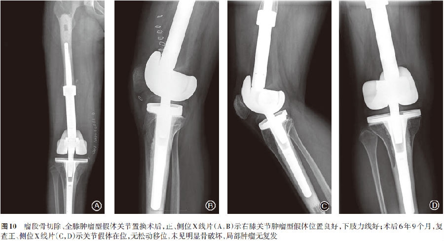 术后再次予以相同方案化疗2个疗程,复查肺部CT未见明显异常,正、侧位X线片示右膝肿瘤假体位置良好(图10A,B)。目前患者保肢手术后7年余,定期随访复查未发现局部复发(图10C,D)及远处转移证据,临床治愈。