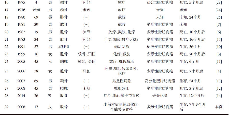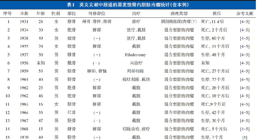 相比脂肪肉瘤其他亚型,多形性脂肪肉瘤具有非常的高转移率和肿瘤相关的死亡率。近来统计表明其转移率超过30%,总死亡率不低于40%。我们统计了自1931年以来英文文献报道的原发性骨内脂肪肉瘤病例(表1),已知明确死亡者为14例(不包含未知预后者),死亡率为48.28%,明显高于发生于间叶组织内的脂肪肉瘤。其中,肺部转移最常见,肝转移较少见(仅2例)。自1981年来,共报道了8例(包括本例在内)具有明确病理证据的原发性骨内多形性脂肪肉瘤患者,其转移率为45.45%,死亡率为54.55%。从这些统计数据来看,原发性骨内多形性脂肪肉瘤预后比较差,转移率和死亡率远较间质性脂肪肉瘤高。