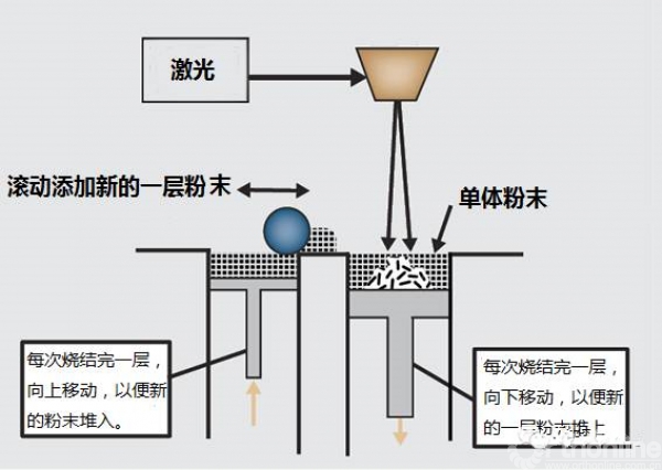 激光烧结(Laser Sintering)的3D打印法:通过单体粉末的逐层烧结,一层层地“堆”出3D结构。