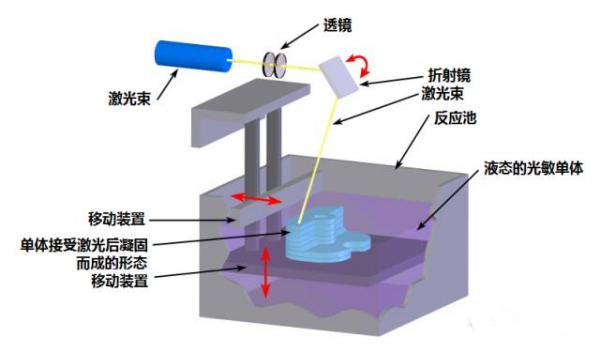 “光固化成型”(或称“立体光雕”)技术(Stereolithography):把激光束射进液态的单体物质池中,使得受照射得光敏单体物质发生聚合固化,有目的地制造出3D结构。
