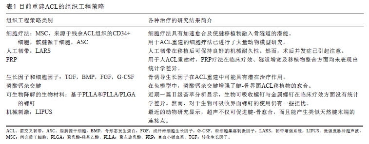 在过去十年间,骨科基础研究已经对加快和改善腱-骨愈合的生物学策略进行了详细深入地探讨。这些策略主要旨在利用生长因子、细胞疗法以及其他各种转化诱导方法,增加腱- 骨界面的生物性愈合。许多研究提出了多种促进重建韧带愈合和再生的实验方法,如采用干细胞及生长因子的组织工程技术,以及基于细胞疗法和组织工程支架的复合策略(图1)。