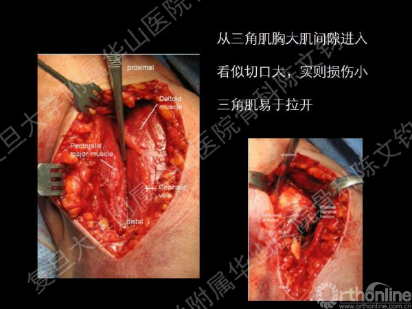 胸三角肌、The extended deltoid-splitting approach(无差异,胸三角损伤较小)
