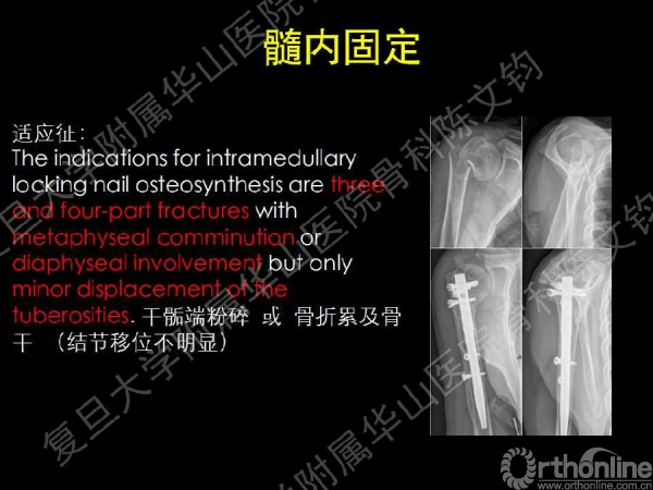 髓内固定适应症:干骺端粉碎或骨折累及骨干(结节移位不明显)