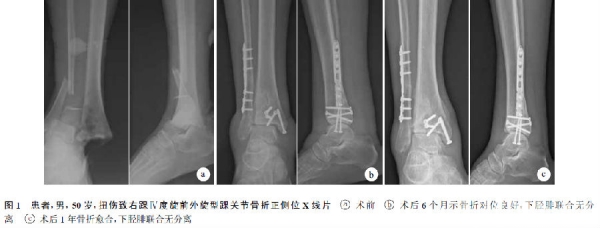 于持续硬膜外麻醉下,患者取侧卧位手术。内踝采用内侧入路;腓骨根据骨折线高度选择入路,高度<6cm者采用后外侧入路,可同时显露腓骨及后踝,高度>6cm者采用腓骨外侧入路;后踝采用后外侧入路;下胫腓联合前韧带作前方小切口。术中见三角韧带深、浅层及下胫腓联合后韧带均与骨折块完整附着。首先复位腓骨骨折,钢板螺钉加压坚强固定;然后复位内踝骨折并用2枚4.0mm螺钉加压固定,直视下缝合修补下胫腓联合前韧带,尽量恢复其正常形态。最后复位后踝骨块并用1~2枚3.0mm螺钉固定。固定后行拉钩试验判断下胫腓联合稳定性。术后石膏固定踝关节1周;6~8周摄X线片,示骨折线模糊后开始部分负重锻炼;10~12周开始完全负重。