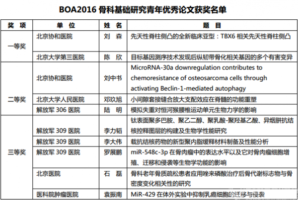 BOA2016骨科基础研究青年优秀论文获奖名单揭晓