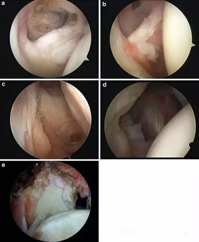 图3 肩胛下肌腱撕裂类型: a 肌腱上缘磨损; b 上1/3肌腱撕裂; c 全层撕裂,下部分肌肉仍有附着; d 全部撕裂,肱骨头游离,但是没有盂肱关节炎; e 巨大肩袖撕裂,同时伴有全层肩胛下肌肌腱撕裂且累及肱骨头上方部分。