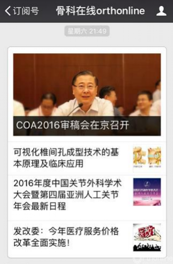 骨科在线微信平台:COA指定官方合作媒体,大会期间每日发布最新会议动态、年度学术精选与知名专家访谈。“我和我的书”也将作为骨科在线微信平台的重点推荐活动,在大会期间强力推出。